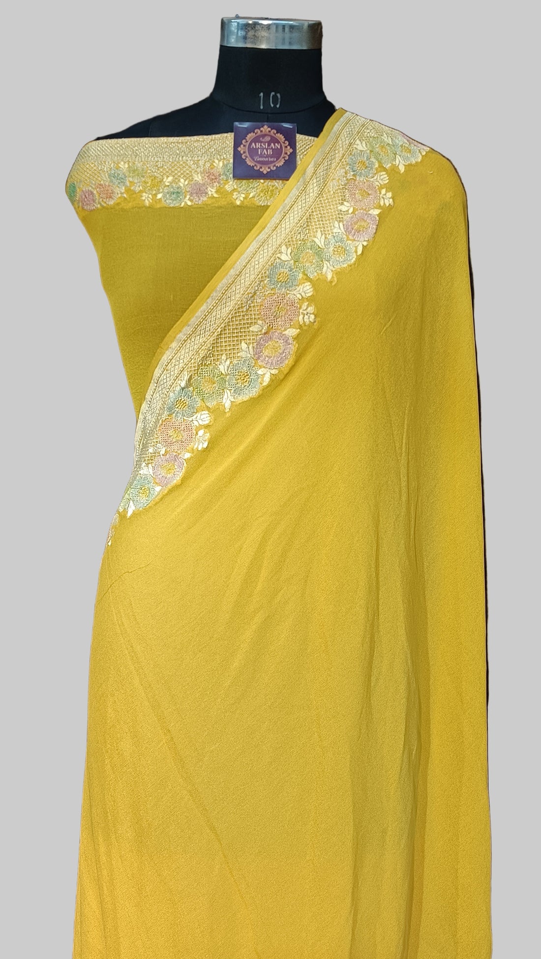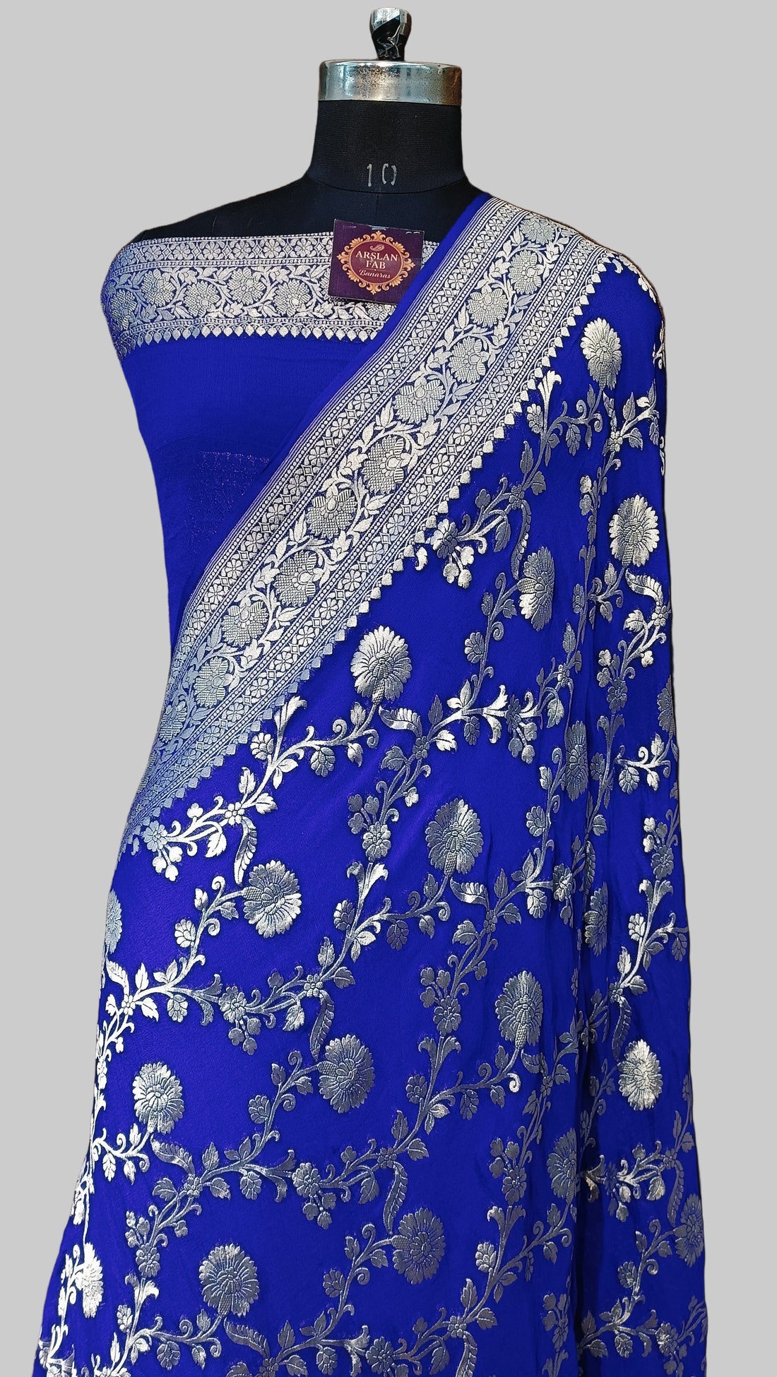 Crafted with fine pure georgette fabric and adorned with intricate handwoven Banarasi motifs, this saree...