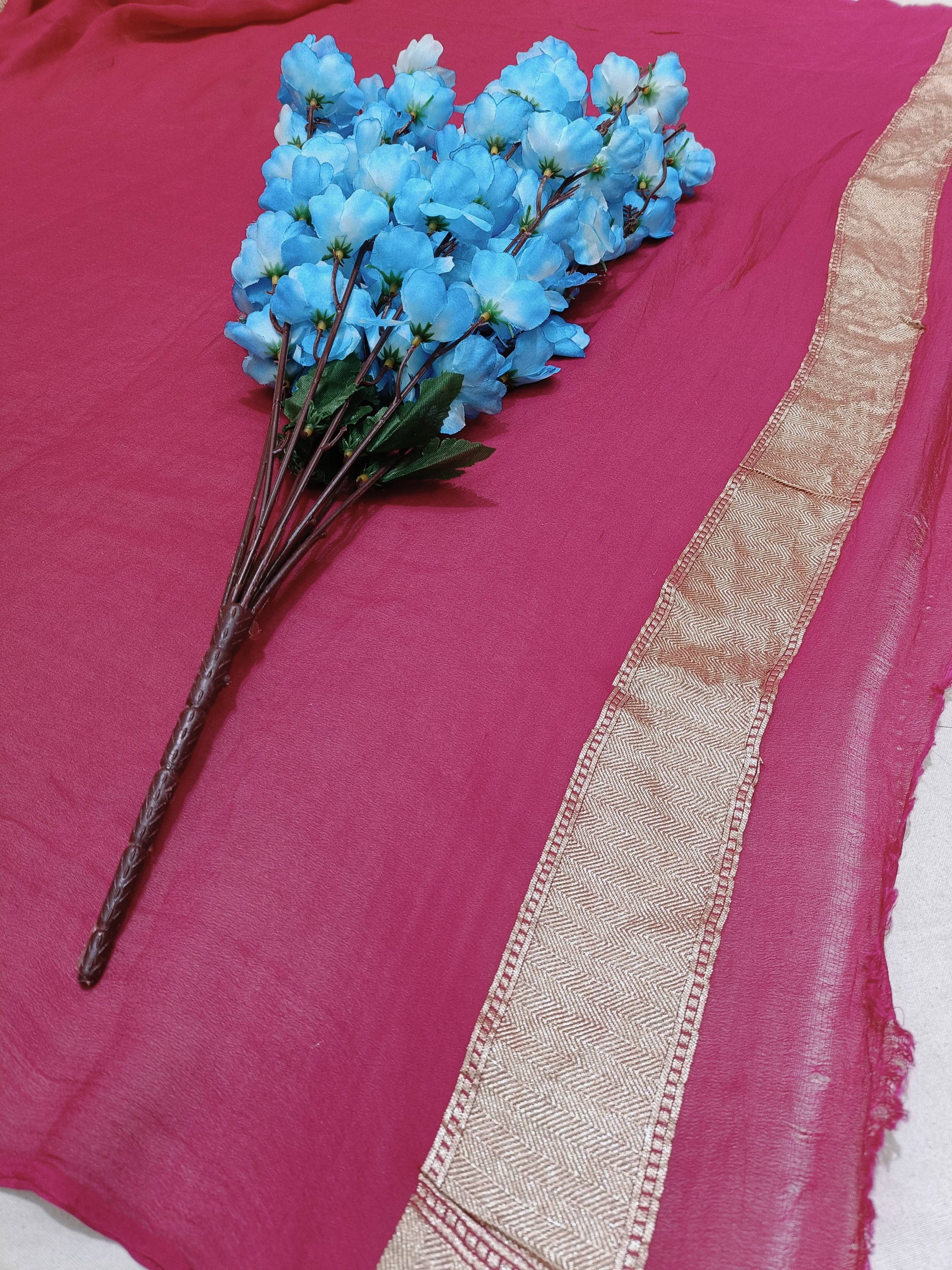 A timeless classic, this Banarasi Khaddi Georgette saree is a beautiful blend of tradition and grace. Handwoven in the heart of Varanasi, it features a soft, lightweight drape with a subtle shimmer. The saree is adorned with delicate zari work and traditional motifs, making it perfect for festive occasions, weddings, and celebrations. Its effortless flow and sheer texture reflect the unmatched artistry of Banarasi weaving.