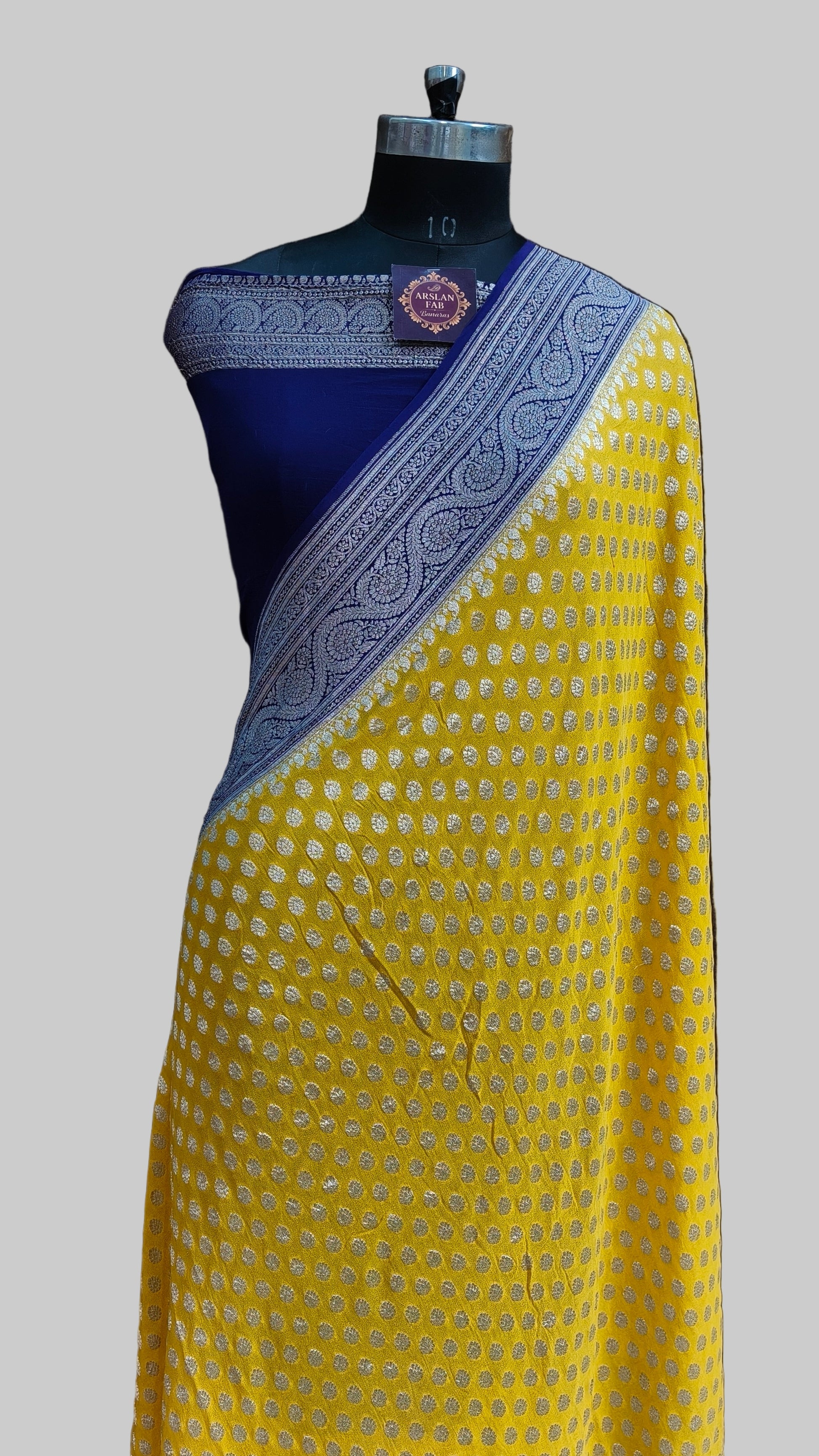 Crafted with fine pure georgette fabric and adorned with intricate handwoven Banarasi motifs, this saree beautifully blends tradition with elegance. Lightweight, flowy, and richly detailed with zari weaving