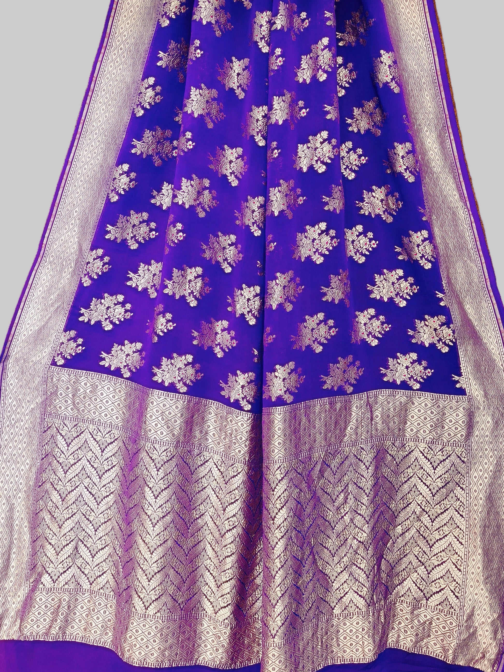 Crafted with fine pure georgette fabric and adorned with intricate handwoven Banarasi motifs, this saree beautifully blends tradition with elegance. Lightweight, flowy, and richly detailed with zari weaving