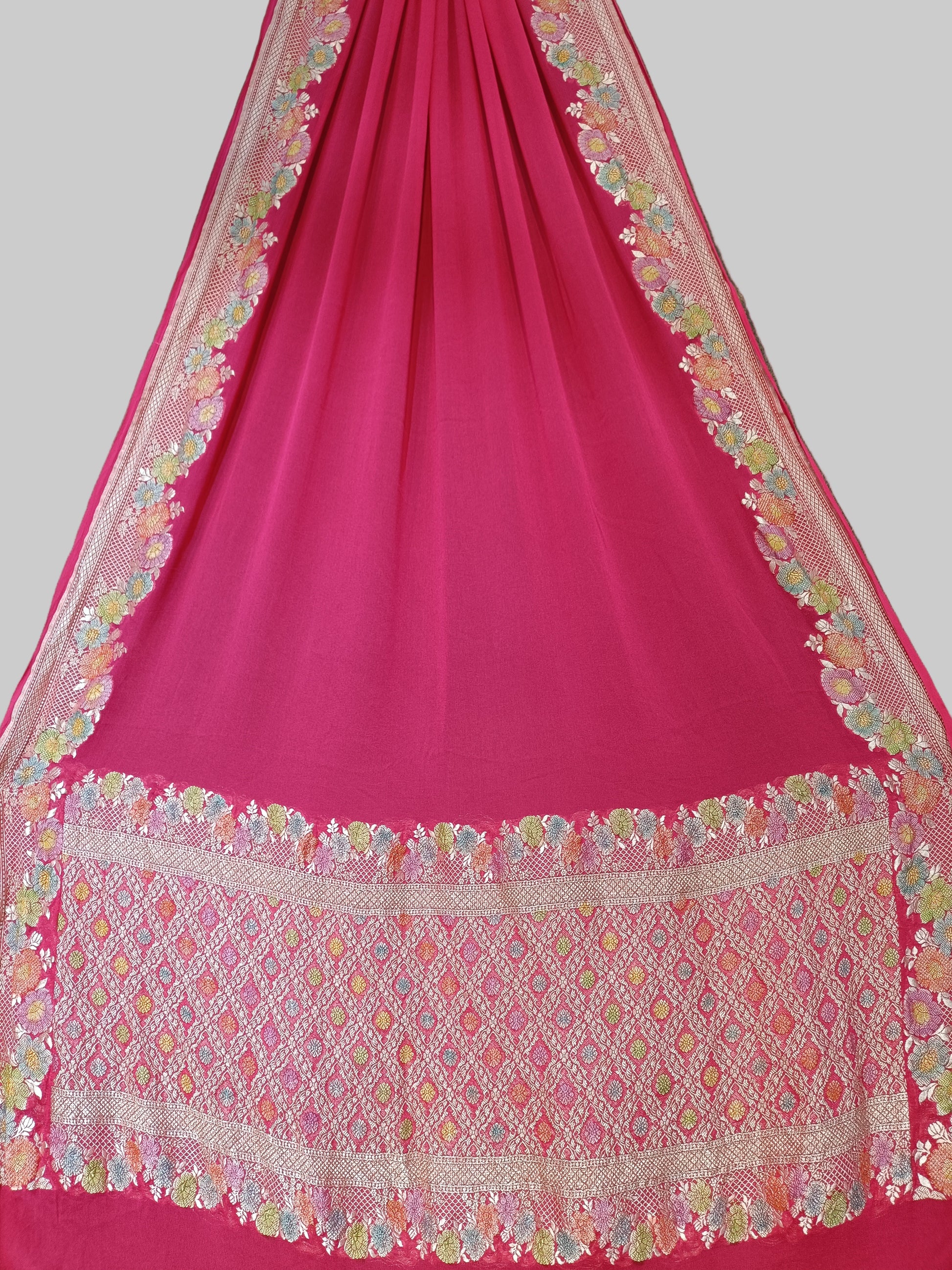 Crafted with fine pure georgette fabric and adorned with intricate handwoven Banarasi motifs, this saree beautifully blends tradition with elegance. Lightweight, flowy, and richly detailed with zari weaving
