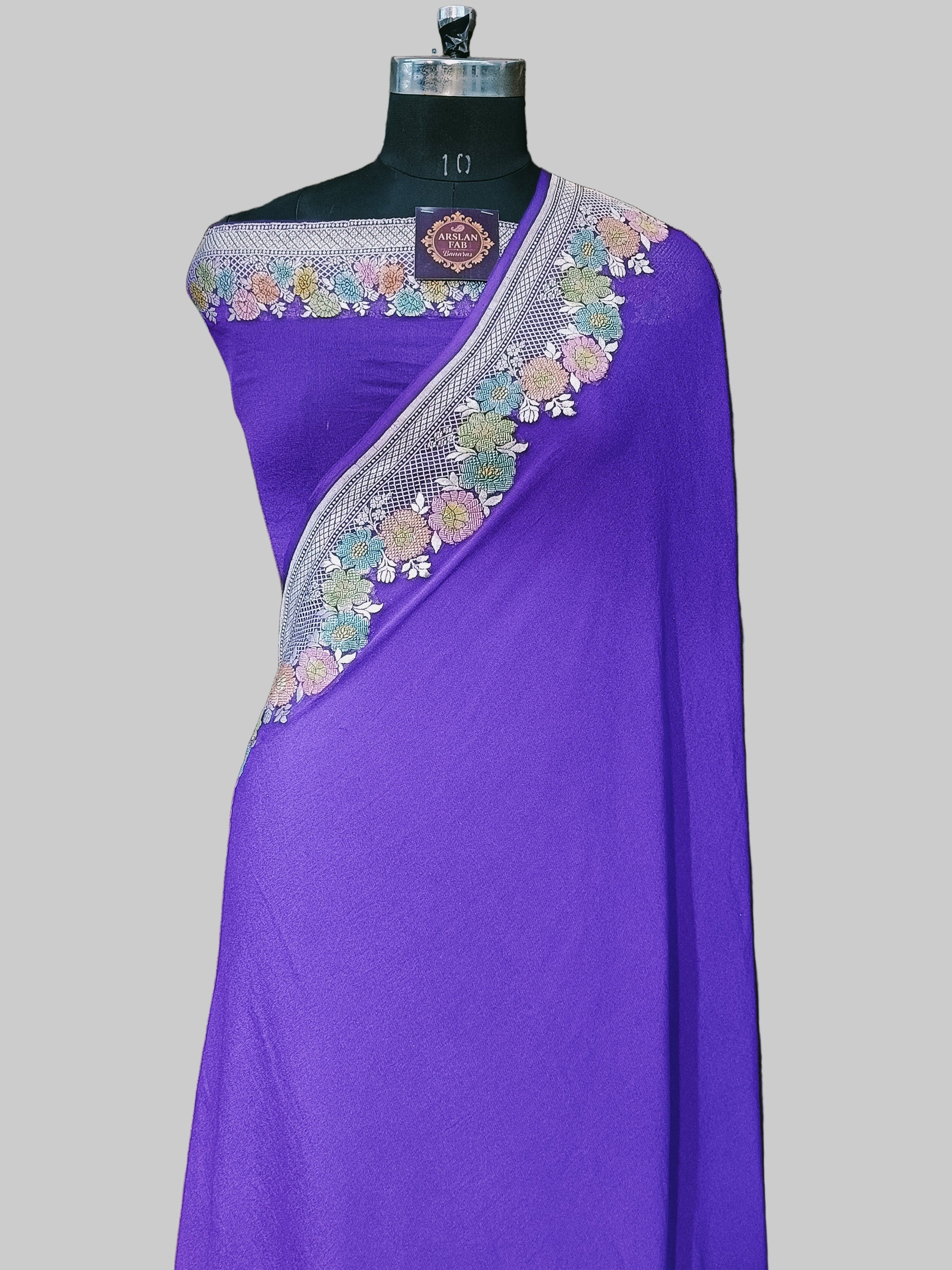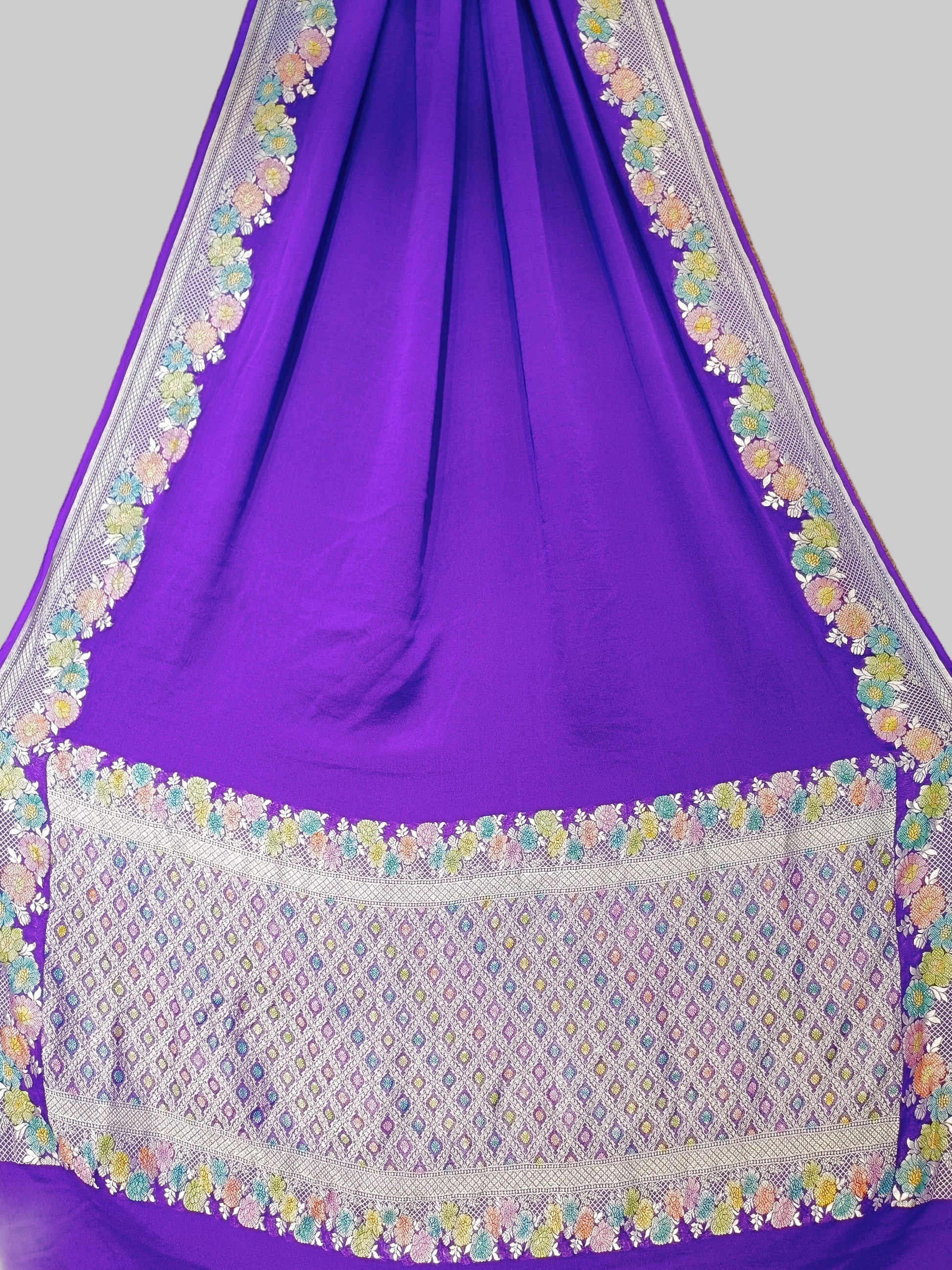 Crafted with fine pure georgette fabric and adorned with intricate handwoven Banarasi motifs, this saree beautifully blends tradition with elegance. Lightweight, flowy, and richly detailed with zari weaving