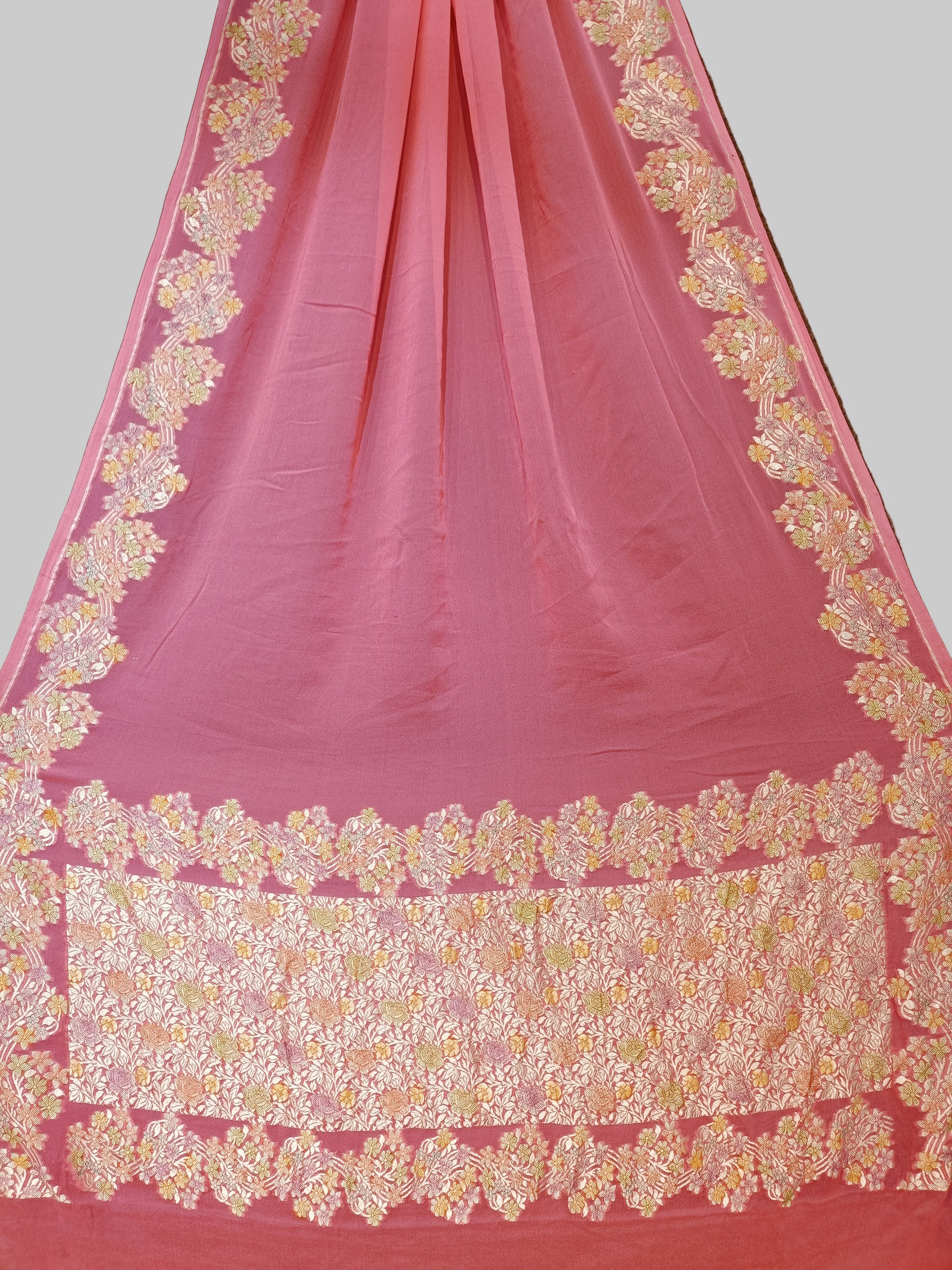 Crafted with fine pure georgette fabric and adorned with intricate handwoven Banarasi motifs, this saree beautifully blends tradition with elegance. Lightweight, flowy, and richly detailed with zari weaving,
