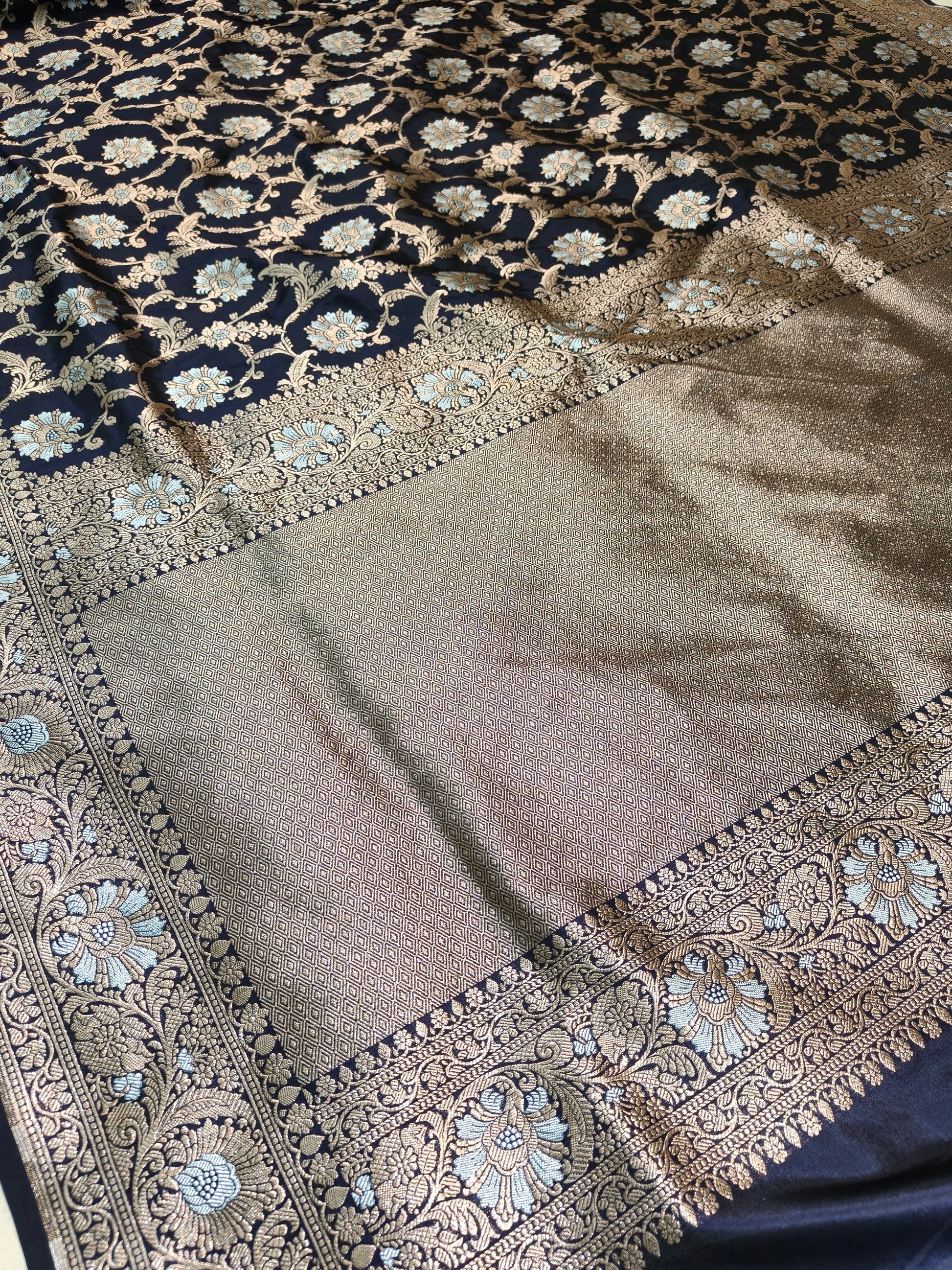 Indulge in timeless luxury with our Pure Katan Silk Saree, a true masterpiece of Banarasi craftsmanship. Woven from the finest pure mulberry silk threads, Katan silk is known for its rich texture, natural sheen, and durable yet soft feel.