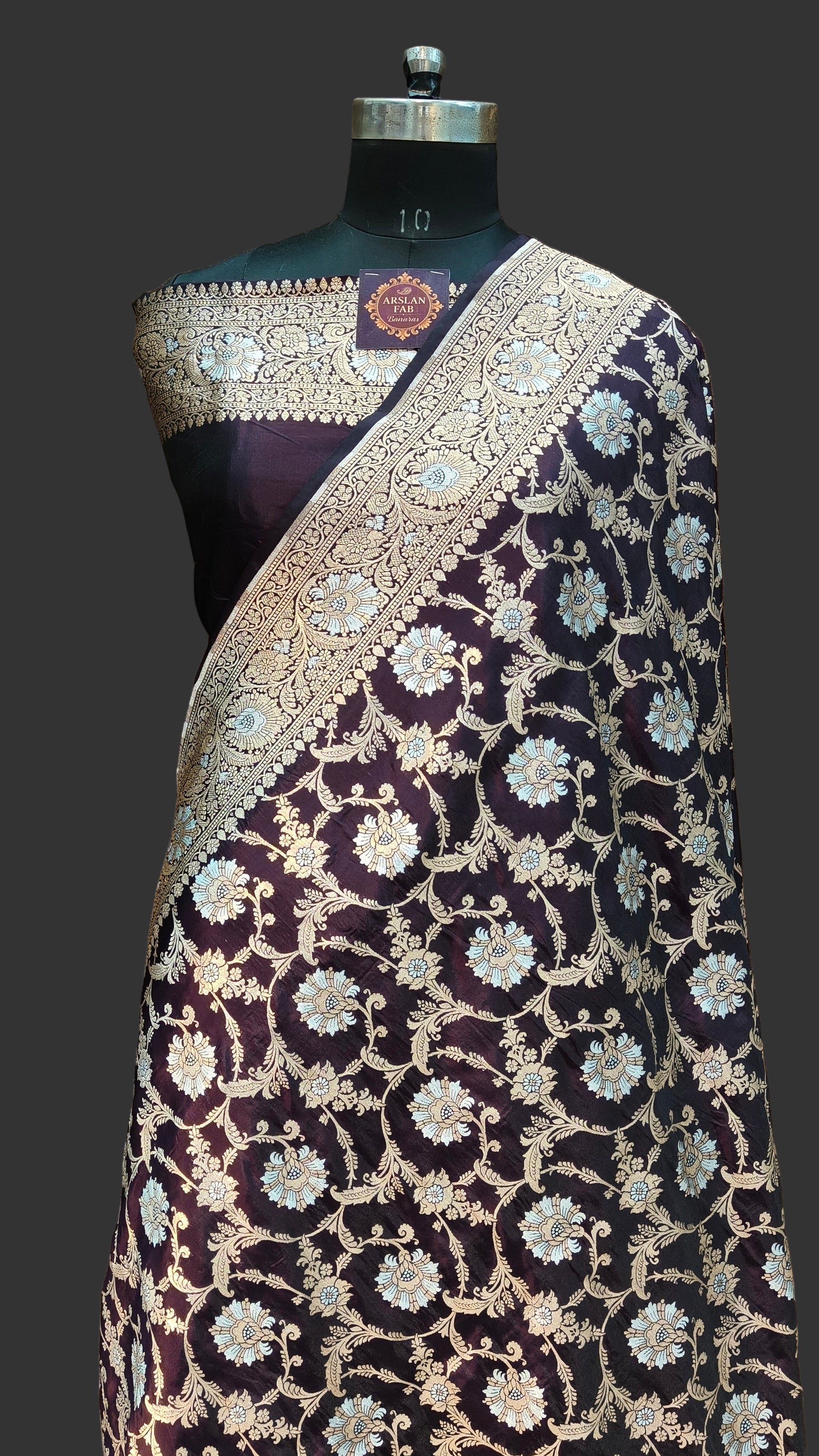 Indulge in timeless luxury with our Pure Katan Silk Saree, a true masterpiece of Banarasi craftsmanship. Woven from the finest pure mulberry silk threads, Katan silk is known for its rich texture, natural sheen, and durable yet soft feel.