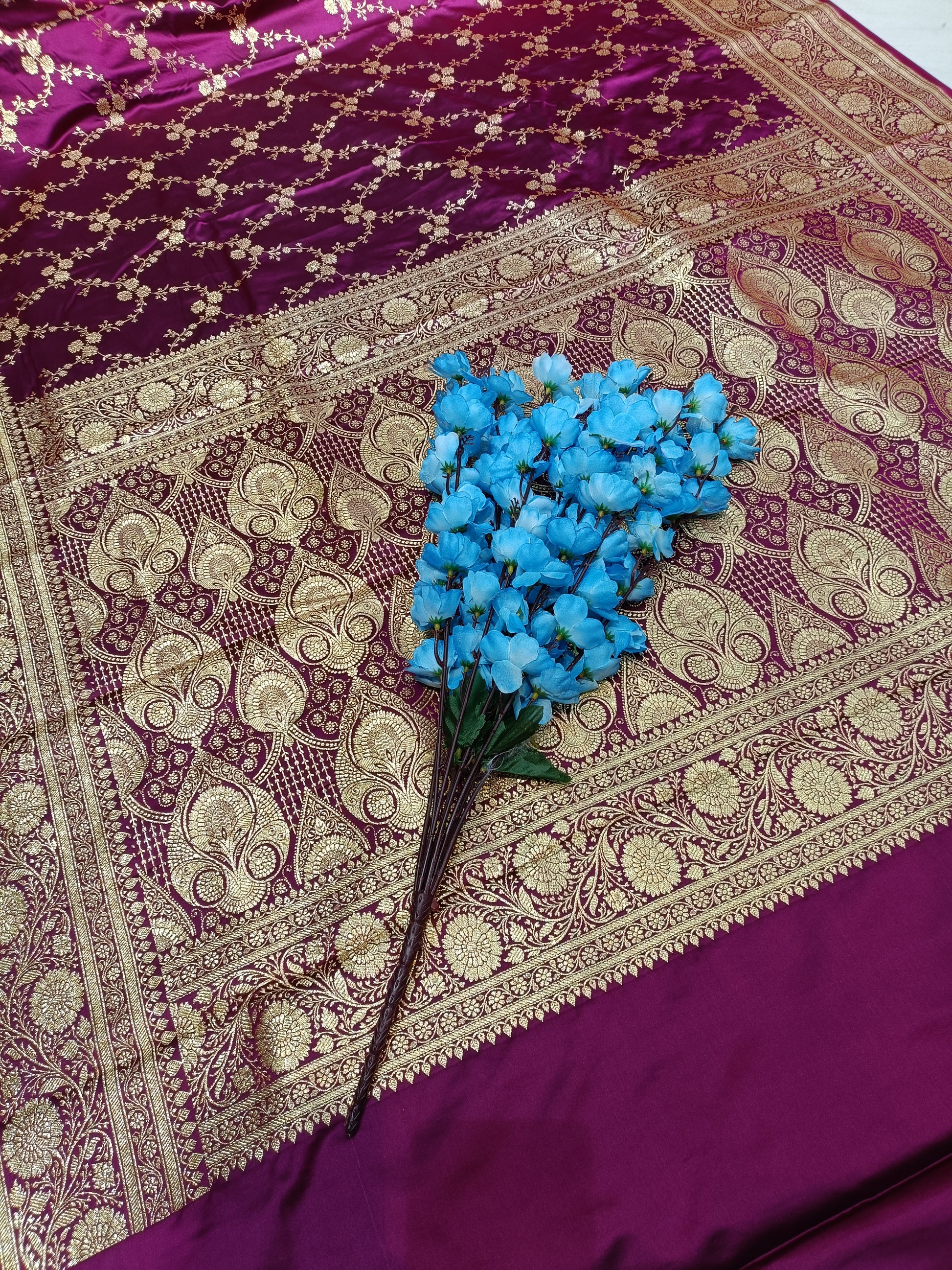 A Banarasi Satin Saree is a luxurious blend of smooth satin silk and the timeless artistry of Banaras weaving. Known for its lustrous finish, soft texture, and royal drape