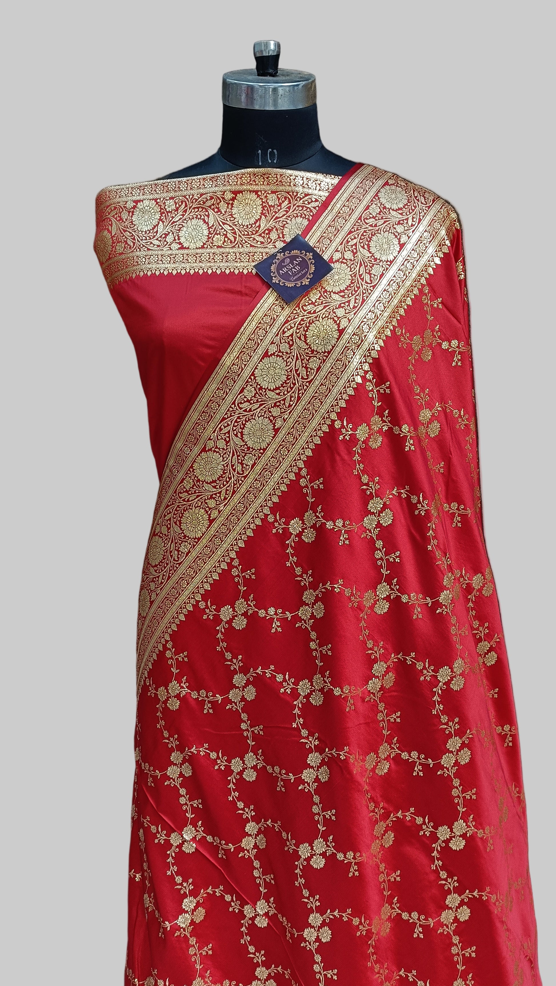 A Banarasi Satin Saree is a luxurious blend of smooth satin silk and the timeless artistry of Banaras weaving. Known for its lustrous finish, soft texture, and royal drape,