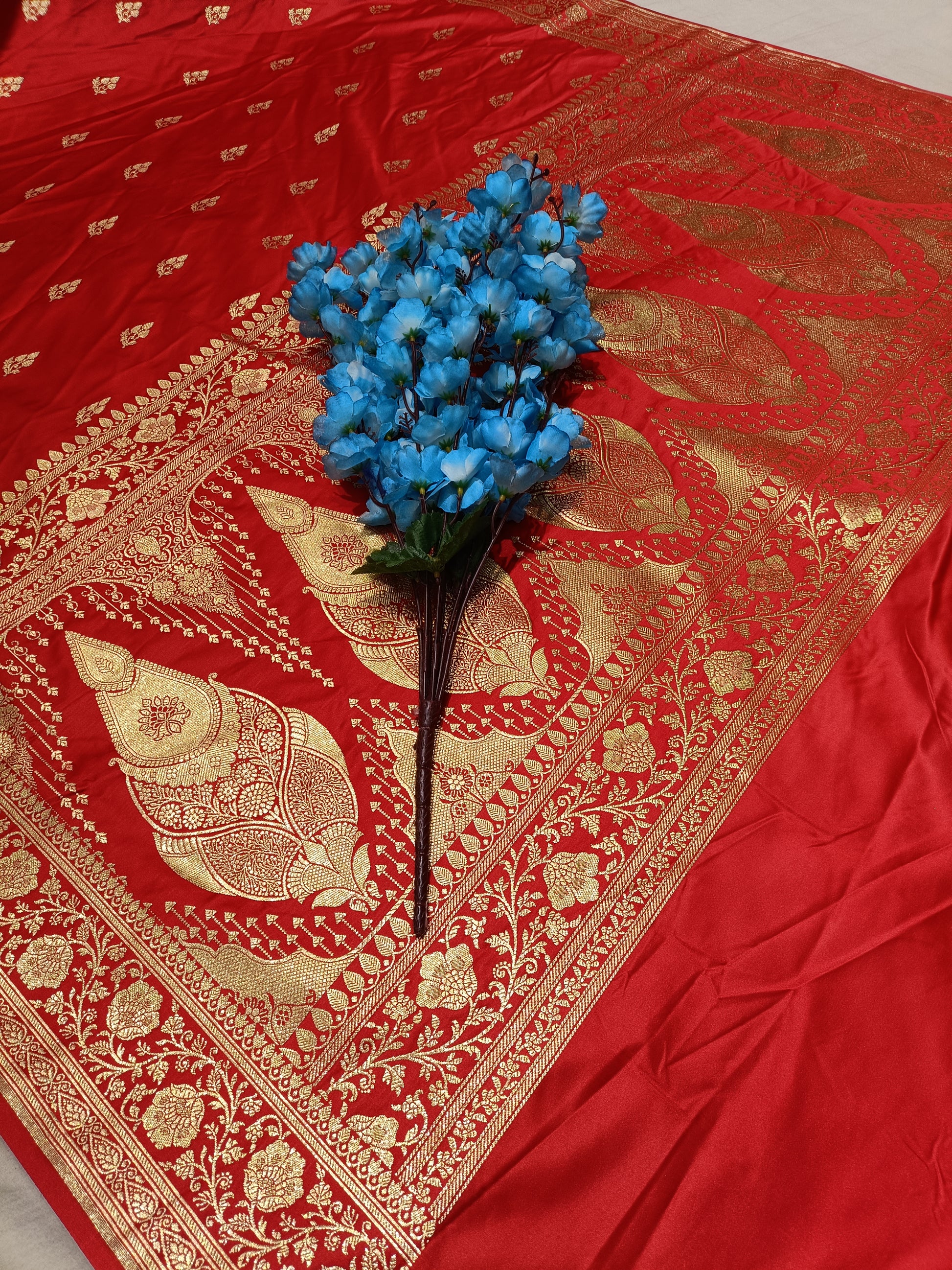 A Banarasi Satin Saree is a luxurious blend of smooth satin silk and the timeless artistry of Banaras weaving. Known for its lustrous finish, soft texture, and royal drape
