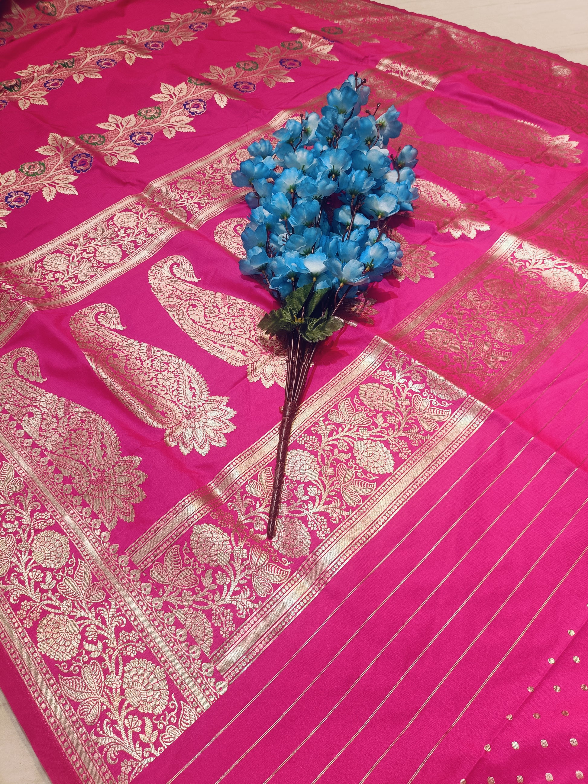 Banarasi Pawri Silk Saree is a perfect blend of royal elegance and traditional craftsmanship. Woven in Varanasi, this saree is crafted from fine Pawri silk,