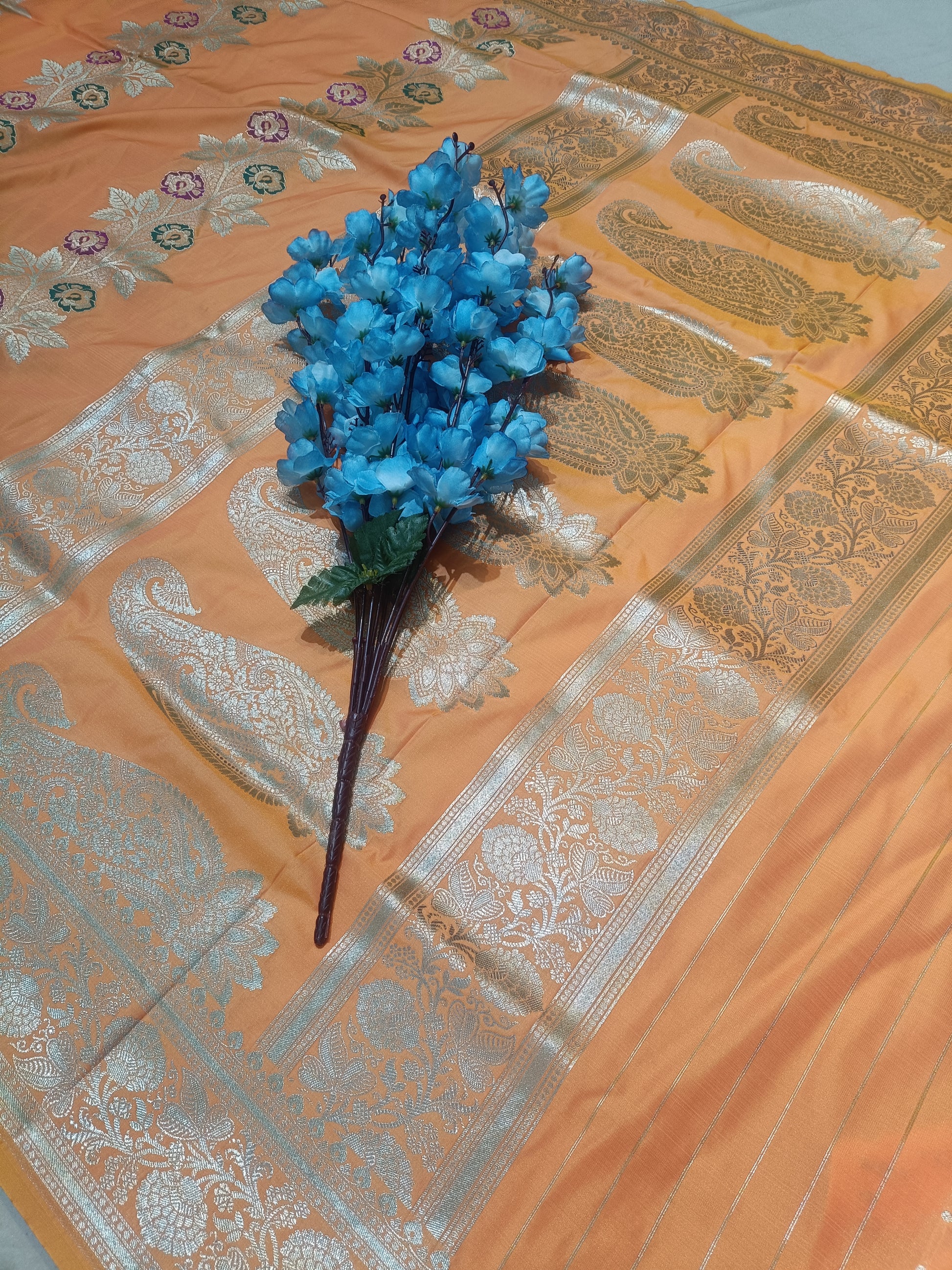 Banarasi Pawri Silk Saree is a perfect blend of royal elegance and traditional craftsmanship. Woven in Varanasi, this saree is crafted from fine Pawri silk,